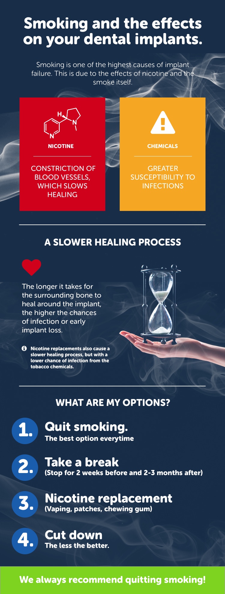 Smoking is one of the highest causes of implant failure. This is due to the effects of nicotine and the smoke itself.
